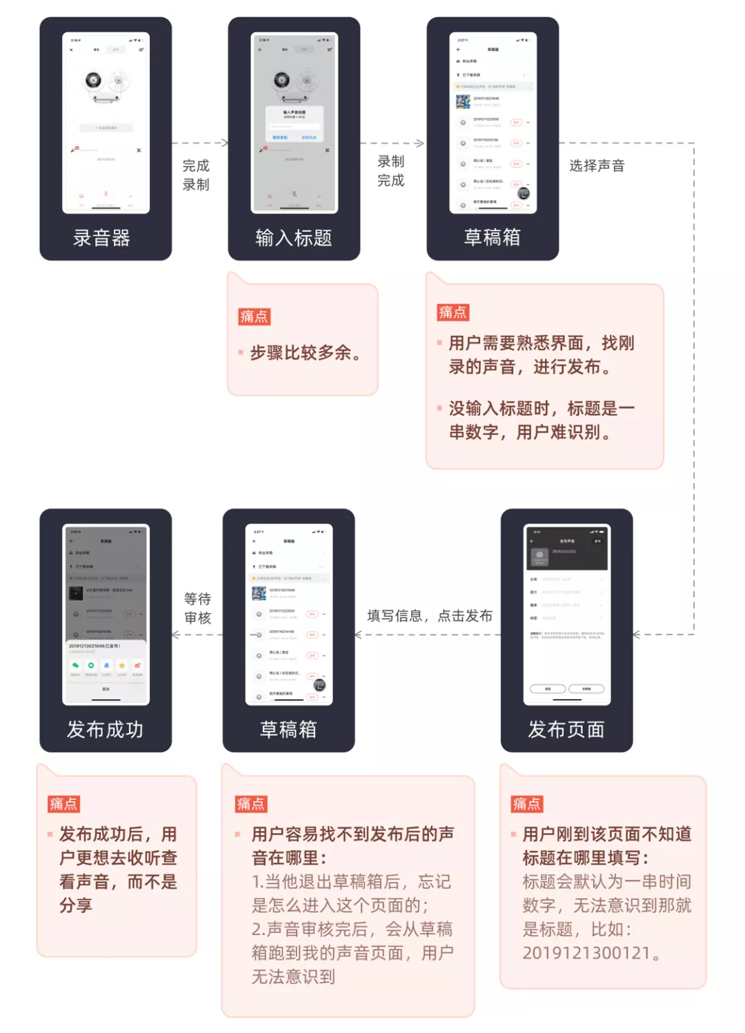 用户从录音���到发布完成,需经过6步冗长的操作。